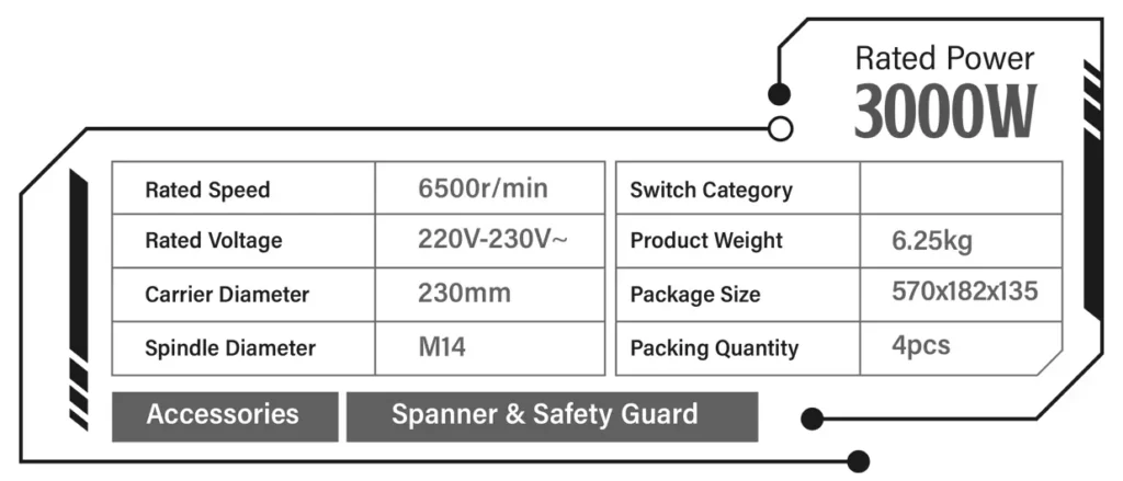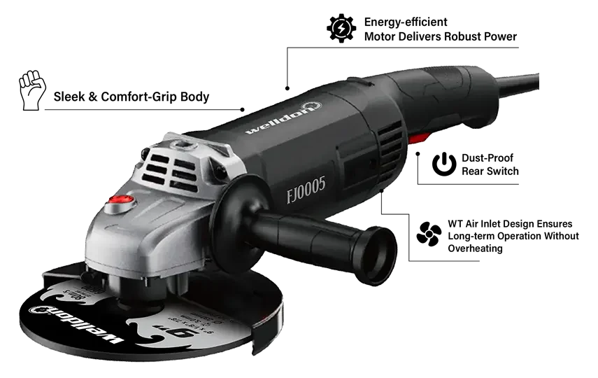 The WELLDON FJ0005 Angle Grinder is a high-powered 3000W tool built for heavy-duty cutting and grinding applications. With 6500 r/min speed and a strong comfort-grip body, it delivers maximum performance and dependable operation for professional and industrial use.